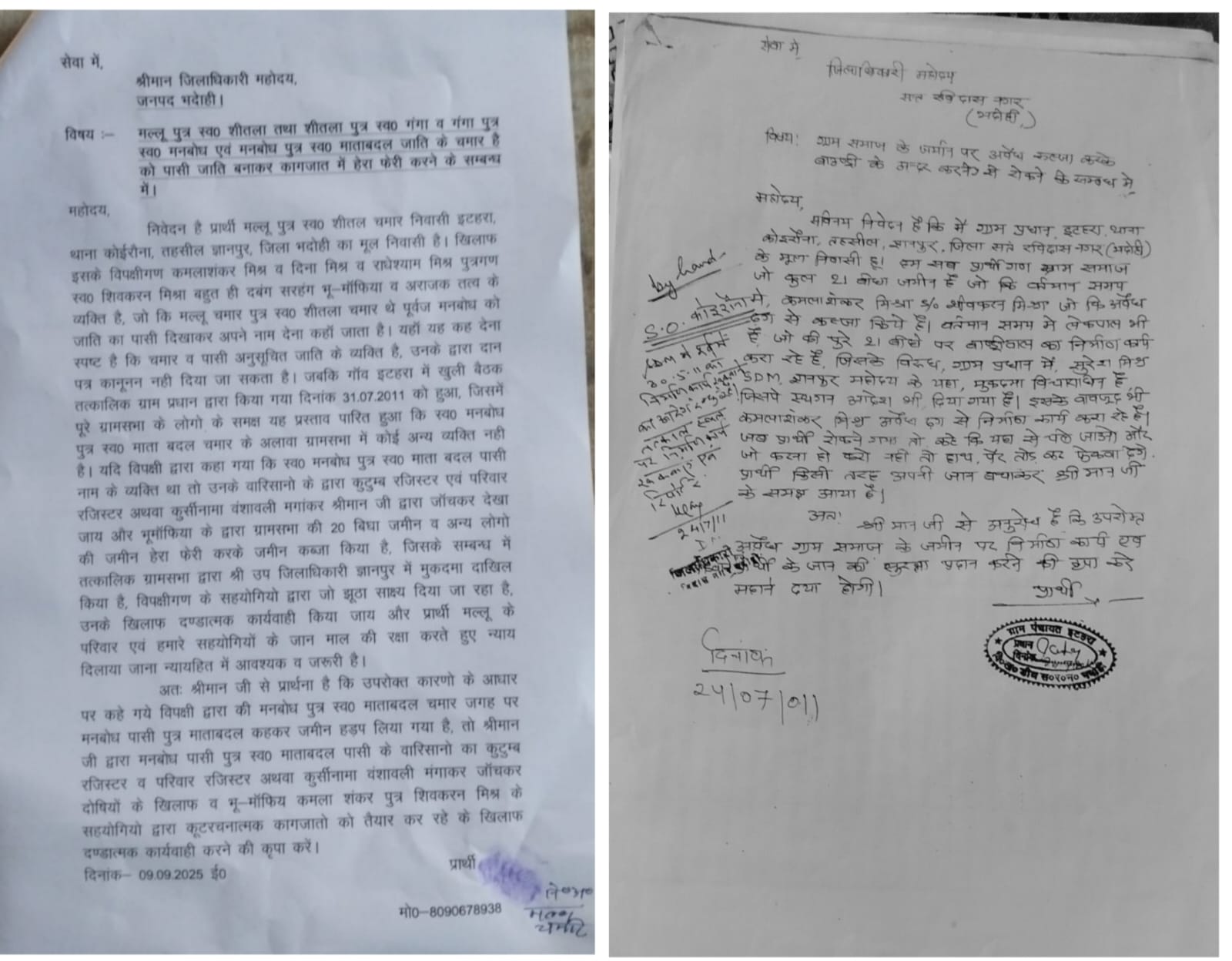 जिलाधिकारी भदोही को भेजे गए प्रार्थना पत्र में दिव्यांग दलित मल्लू पुत्र स्वर्गीय शीतल चमार निवासी इटहरा ग्राम थाना कोइरौना तहसील ज्ञानपुर जिला भदोही में प्रार्थना पत्र भेज कर विपक्षीगण कमला शंकर मिश्रा, राधेश्याम मिश्रा के विरुद्ध कार्रवाई की मांग की है। जिलाधिकारी को भेजे गए शिकायती पत्र में कहा गया है कि दिव्यांग दलित मल्लू चमार पुत्र स्वर्गीय शीतल थे। उनके पूर्वज को जाति का पासी दिखाकर भू माफिया कमला शंकर मिश्रा ने उनकी जमीन हड़प ली है।