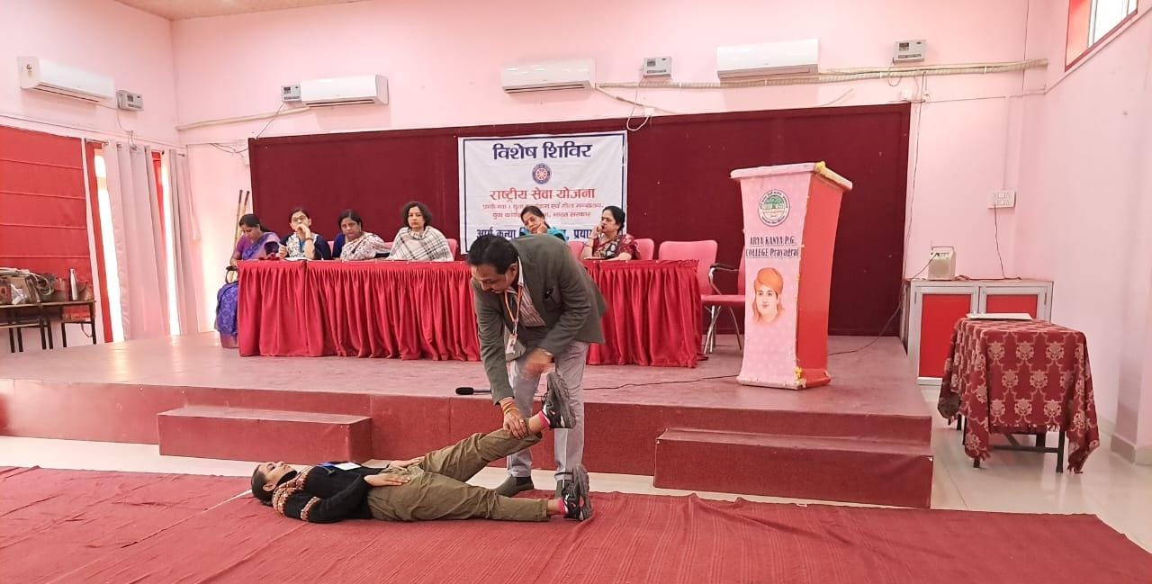 शिविर के द्वितीय सत्र में अध्यक्ष, शासी निकाय श्री पंकज जायसवाल ने स्वंयसेविकाओं को सम्बोधित करते हुए कहा कि उन सभी को प्राथमिक उपचार की जानकारी रखना आवश्यक है। प्राचार्या प्रो० अर्चना पाठक ने प्राथमिक चिकित्सा के महत्व पर प्रकाश डाला। इसी क्रम में डॉ० संजय बरनवाल (नोडल अधिकारी, आपदा सेवा, सीएमओ, प्रयागराज) ने स्वयंसेविकाओं को प्राथमिक उपचार के विषय में बताते हुए कहा कि ‘डॉक्टर ए.बी.सी. इज कम्प्लीट फर्स्ट एड’ साथ ही उन्होने सी.पी.आर. (कार्डियोपल्मोनरी रिससिटेशन) को व्यवहारिक रूप से अवगत कराया। इसके अतिरिक्त एम्बुलेन्स की अनुपस्थिति में स्ट्रेचर तैयार करना और हॉस्पिटल ले जाना आदि के बारे में वृहद जानकारी स्वंयसेविकाओं को प्रदान की।