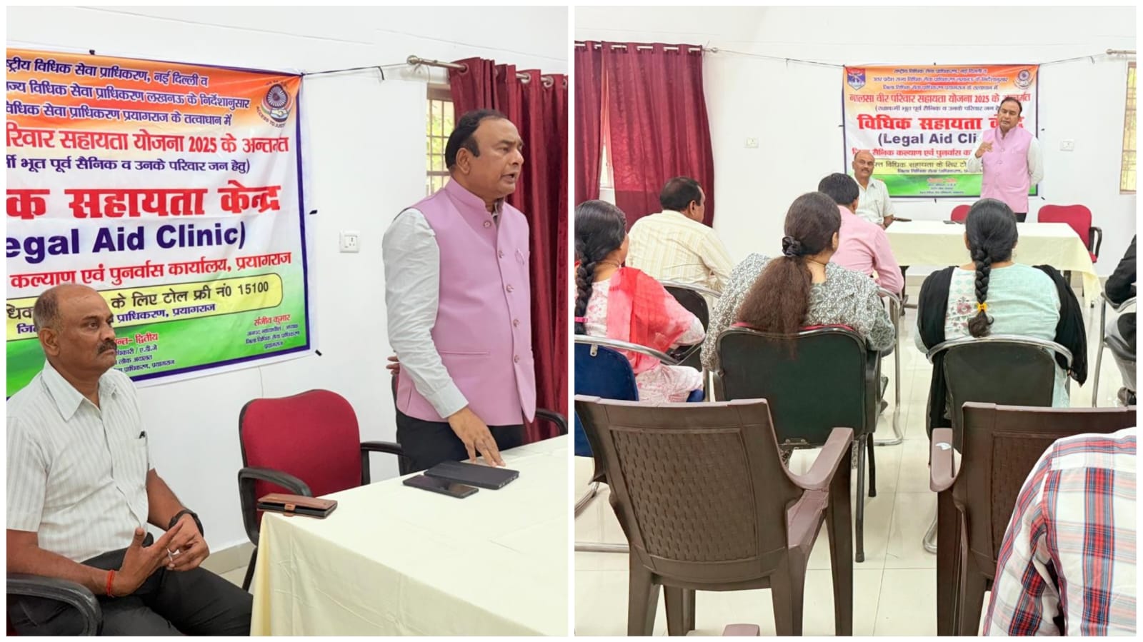 संयम भारत, प्रयागराज, उत्तर प्रदेश राज्य विधिक सेवा प्राधिकरण लखनऊ व जनपद न्यायाधीश अध्यक्ष जिला विधिक सेवा प्राधिकरण प्रयागराज संजीव कुमार के निर्देशानुसार नालसा वीर परिवार सहायता योजना 2025 के तहत रक्षा कर्मियों, भूतपूर्व सैनिको व उनके परिवारजन को विधिक सहायता उपलब्ध करवाने के लिए जिला सैनिक कल्याण एवं पुनर्वास कार्यालय में जिला विधिक सेवा प्राधिकरण की ओर से दिनांक 8.8.2025 को लीगल एड क्लीनिक का उद्घाटन सचिव जिला विधिक सेवा प्राधिकरण दिनेश कुमार गौतम के द्वारा किया गया था । दिनांक 11.8.2025 को जिला सैनिक सहायता एवं पुनर्वास कार्यालय प्रयागराज में विधिक सहायता शिविर का आयोजन सचिव जिला विधिक सेवा प्राधिकरण की अध्यक्षता में किया गया।