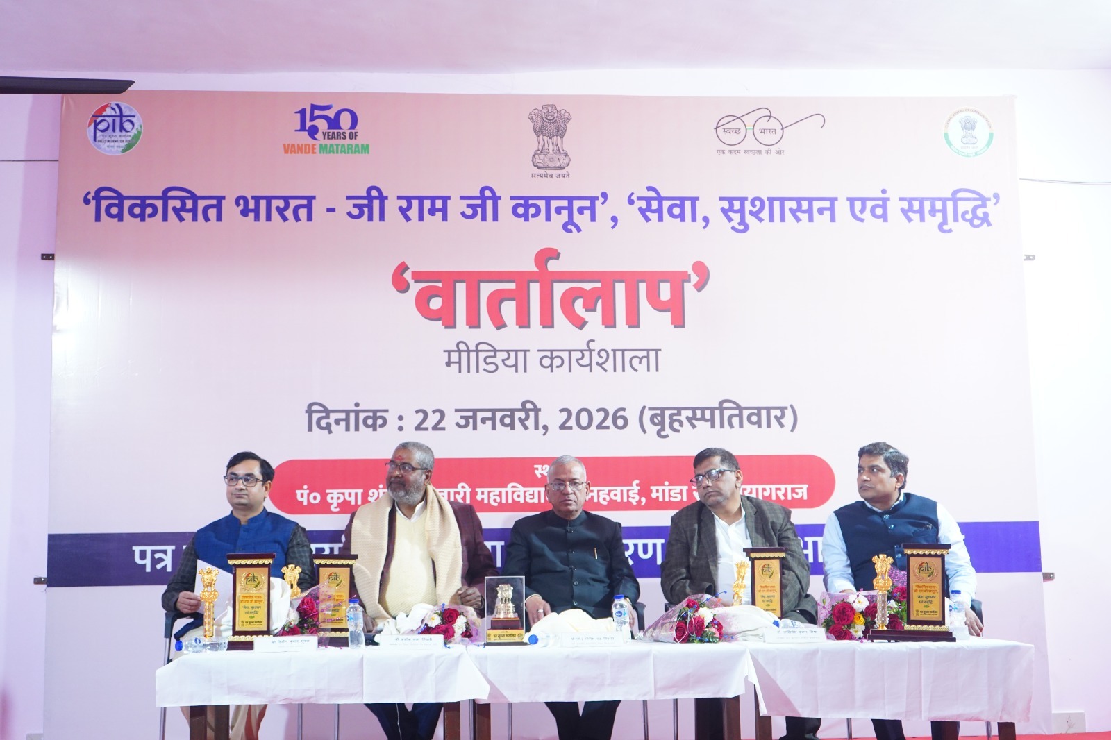 संयम भारत संवाददाता प्रयागराज,दिनांक – 24 जनवरी से 28 जनवरी 2026 के बीच केंद्रीय संचार ब्यूरो द्वारा ‘इंटीग्रेटेड कम्युनिकेशन एंड आउटरीच प्रोग्राम’ के तहत ‘विकसित भारत – जी राम जी कानून’, ‘सेवा, सुशासन एवं समृद्धि’ विषय पर मेजा तहसील के पंडित कृपा शंकर महाविद्यालय में 05 दिवसीय प्रदर्शनी तथा संगोष्ठी का आयोजन किया जायेगा आयोजन।पत्र सूचना कार्यालय द्वारा बृहस्पतिवार को प्रयागराज जिले के मेजा तहसील के पंडित कृपाशंकर तिवारी महाविद्यालय में ‘वार्तालाप कार्यक्रम’ (ग्रामीण मीडिया कार्यशाला) का आयोजन किया गया। ‘कार्यशाला’ में हाल में भारतीय संसद द्वारा बनाये गये ‘विकसित – भारत जी राम जी कानून’ तथा केंद्र सरकार द्वारा जन कल्याण हेतु बनायी गयी नीतियों, जनकल्याणकारी कार्यक्रमों एवं सन 2047 तक देश को विकसित बनाने के संकल्पों पर चर्चा हुई। कार्यक्रम में बड़ी संख्या में स्थानीय पत्रकारों द्वारा भागीदारी की गयी ।कार्यक्रम के शुरुआत में राष्ट्रगीत ‘वंदे मातरम’ के 150 पूर्ण होने के क्रम में उपस्थित लोगों द्वारा सामूहिक रूप से राष्ट्रगीत का गायन किया गया। कार्यक्रम को मुख्य अतिथि के रूप में काशी हिंदू विश्वविद्यालय के पूर्व कुलपति प्रोफेसर गिरीश चंद्र त्त्रिपाठी, अतिथि एवं वक्ता के रूप में पूर्व उप शिक्षा निदेशक एवं समाजसेवी अशोक नाथ तिवारी, वरिष्ठ पत्रकार एवं अध्यक्ष बाल कल्याण समिति डॉ. अखिलेश मिश्रा, बैंक ऑफ़ बड़ौदा के उप क्षेत्रीय प्रबंधक अनूप शुक्ल तथा पत्र सूचना कार्यालय एवं केंद्रीय संचार ब्यूरो, उत्तर प्रदेश के निदेशक दिलीप कुमार शुक्ल द्वारा संबोधित किया गया। ‘मीडिया कार्यशाला’ को संबोधित करते हुये काशी हिंदू विश्वविद्यालय के पूर्व कुलपति प्रोफेसर गिरीश चंद्र त्रिपाठी ने कहा कि ‘विकसित भारत – जी राम जी कानून’ सेवा, सुशासन और समृद्धि की भावना पर आधारित एक महत्वपूर्ण पहल है, जिसका उद्देश्य ग्रामीण भारत को आत्मनिर्भर बनाना है। उन्होंने कहा कि यह कानून प्रत्येक पात्र ग्रामीण परिवार को वर्ष में 125 दिनों के रोजगार की गारंटी प्रदान करता है, जो ‘मनरेगा’ के तहत दिये जाने वाली 100 दिनों के रोजगार की गारंटी से आगे का कदम है।अतिथि एवं वक्त के रूप में कार्यक्रम को संबोधित करते हुये सेवानिवृत्त उप शिक्षा निदेशक एवं समाजसेवी अशोक नाथ तिवारी ने कहा कि ‘विकसित भारत -जी राम जी कानून’ सरकार की सेवा, सुशासन और समृद्धि की भावना पर आधारित है, जो देश को विकास के मार्ग पर आगे ले जाने में सहायक सिद्ध होगा। वार्तालप कार्य्रकम के दौरान बाल कल्याण समिति के प्रयागराज के अध्यक्ष डां. अखिलेश कुमार मिश्रा ने कहा कि विकसित भारत केवल एक नारा नहीं, बल्कि देश के समग्र विकास का संकल्प है, जिसकी आध