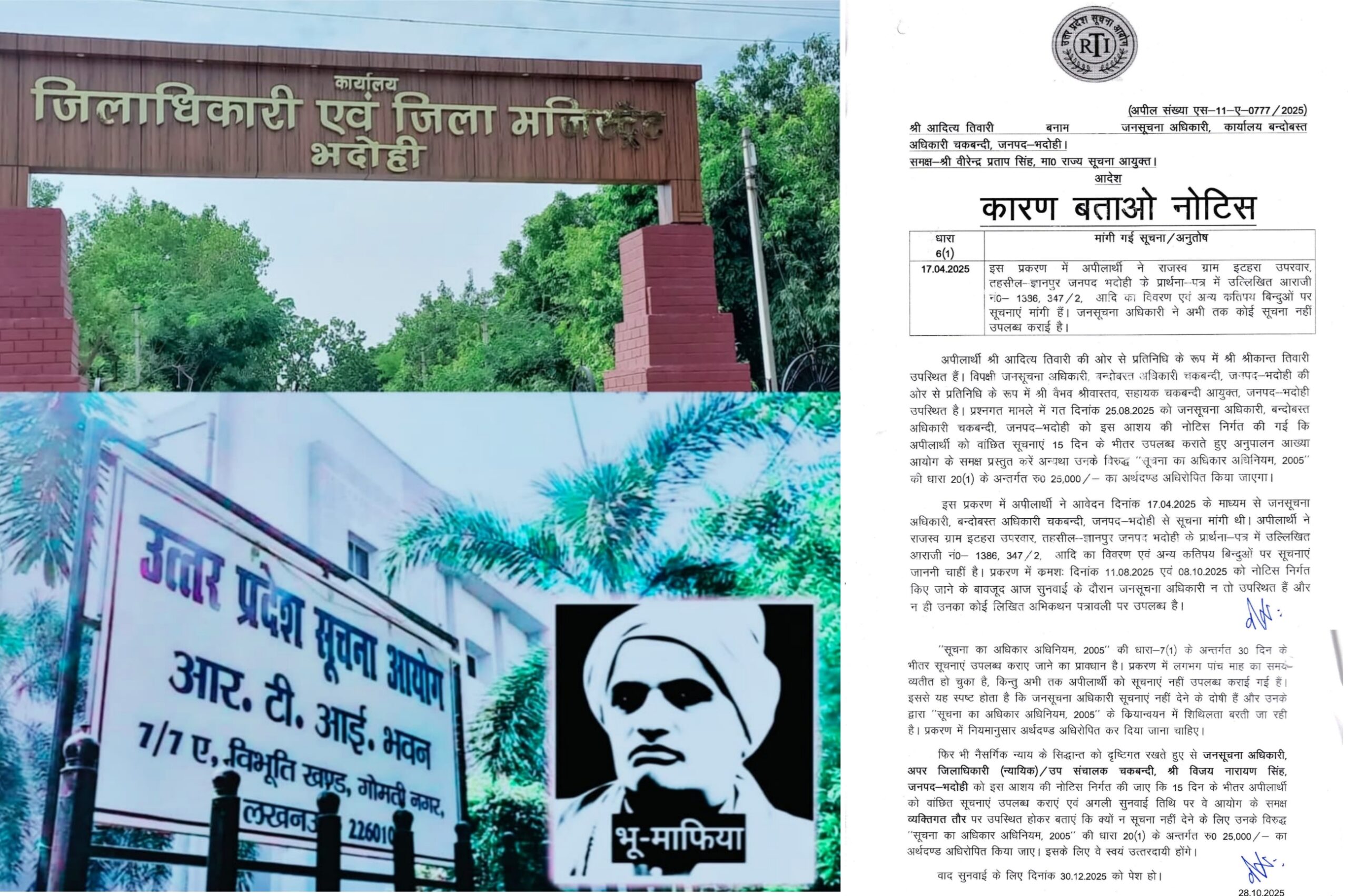 संयम भारत संवाददाता व्यूरो,भदोही,ज्ञानपुर तहसील का चर्चित भू-माफिया कमला शंकर मिश्र को बचाने में पूरा तहसील प्रशासन लगा हुआ है। जन सूचना अधिकारी, अपर जिलाधिकारी न्यायिक/ उप संचालक चकबंदी द्वारा सही जानकारी नहीं दिए जाने के कारण राज्य सूचना आयोग खफा है। सूचना आयुक्त ने अपर जिलाधिकारी न्यायिक, भदोही को निर्देश दिया है कि 15 दिवस के भीतर अपीलार्थी को सही सूचनाएं उपलब्ध करायें एवं कृत्य कार्यवाही से आयोग को भी अवगत करायें लेकिन जन सूचना अधिकारी उपसंचालक चकबंदी की ओर से शिथिलता बढ़ती जा रही है जिसके लिए क्यों न सूचना नहीं देने के लिए उनके विरुद्ध सूचना का अधिकार अधिनियम 2005 की धारा 20 (1) के अंतर्गत रु. 25000/- का अर्थ दंड अधिरोपित किया जाए। विपक्षी जन सूचना अधिकारी, अपर जिलाधिकारी न्यायिक, जनपद भदोही को निर्देशित किया जाता है कि अगली सुनवाई तिथि पर व्यक्तिगत रूप से उपस्थित होकर प्रकरण से संबंधित समस्त दस्तावेजों के साथ आयोग के समक्ष उपस्थित हो। अन्यथा उनके विरुद्ध कार्रवाई की जाएगी। जन सूचना अधिकारी की हरकतों से जाहिर हो गया है कि यही लोग भू-माफिया कमला शंकर मिश्र को बचाने में लगे हैं। भू-माफिया कमला शंकर मिश्रा के काले कारनामे अब सबके सामने आने लगे हैं। जन सूचना अधिकारी, उपसंचालक चकबंदी,जनपद भदोही को राज्य सूचना आयुक्त ने व्यक्तिगत रुप से उपस्थिति होने के साथ चेतावनी दी है कि यदि वे तत्काल 15 दिन के भीतर सूचनाओं उपलब्ध न कराए तो उनके विरुद्ध सूचना का अधिकार अधिनियम 2005 की धारा 20(1) के अंतर्गत ₹25000 का दण्ड अधिरोपित किया जाएगा। इसके साथ ही वहां पर जन सूचना अधिकारी, अपर जिलाधिकारी न्यायिक, जनपद भदोही की ओर से सहायक चकबंदी अधिकारी, वैभव श्रीवास्तव उपस्थित थे। और अभिलार्थी की ओर से उनके प्रतिनिधि उपस्थित थे। विपक्षी जन सूचना अधिकारी उप संचालक चकबंदी, जनपद भदोही की ओर से सहायक चकबंदी अधिकारी, उनके प्रतिनिधि के रूप में उपस्थित थे। सुनवाई के दौरान अभिलार्थी के प्रतिनिधि द्वारा अवगत कराया गया की राजस्व विभाग भू-माफिया की मदद कर रहा है इसलिए सूचना नहीं दे रहे हैं और जो दे भी रहे है वह एकदम भ्रामक असत्य दे रहे है जिस पर राज्य सूचना आयुक्त ने कहां की न्यायहित में सुनवाई के लिए एक और अवसर प्रदान किया जाता है। राज्य सूचना आयुक्त ने अपील कर्ताको मूल आवेदन पत्र संलग्न करते हुए उपसंचालक चकबंदी को कारण बताओ नोटिस निर्गत किया गया है कि सूचनाओं 15 दिन के भीतर उपलब्ध कराना सुनिश्चित करें तथा कृत कार्रवाई से आयोग को भी अवगत कराए अन्यथा उनके विरुद्ध दंडात्मक कार्रवाई की जाएगी। राज्य सूचना आयुक्त की इस कार्रवाई से स्पष्ट है कि भदोही जनपद के चकबंदी एवं राजस्व विभाग के सरकारी रिकॉर्ड में हेरा फेरी करके किस